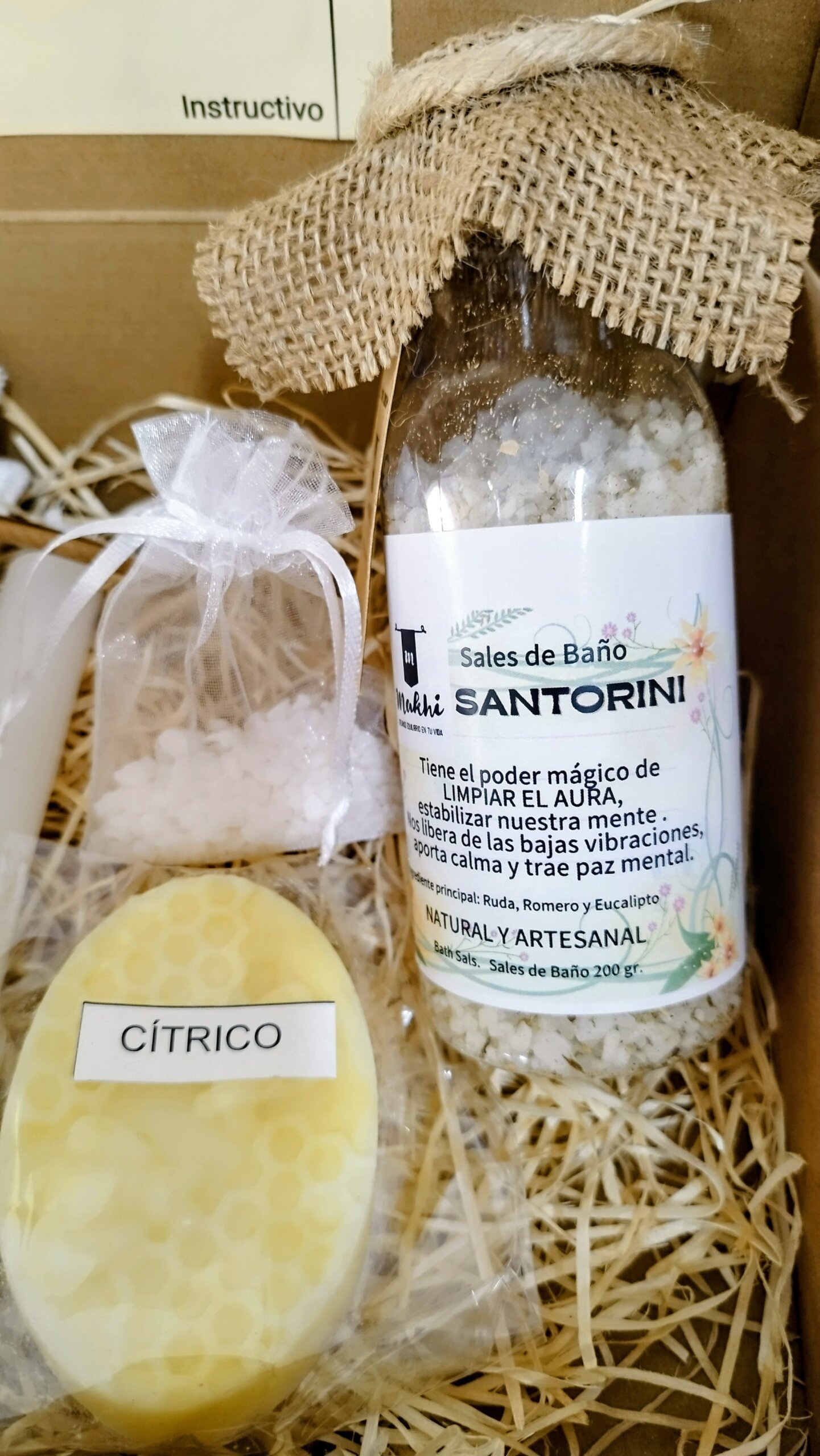 - Bote de sales preparadas y energizadas con Ruda, Romero y Eucalipto